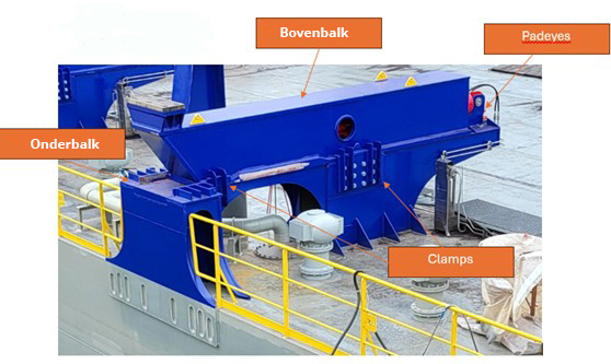 Tijdens het modelleren van de lasnaden werd duidelijk dat de bevestigingspunten (padeyes) van de hydraulische cilinder in de bovenbalk te dicht bij elkaar geplaatst waren. Hierdoor kon de lasser de voorgeschreven laskwaliteit en -dikte niet goed realiseren. In overleg met de klant is er uiteindelijk voor gekozen om de padeyes met een geboute verbinding in de bovenbalk te monteren.
